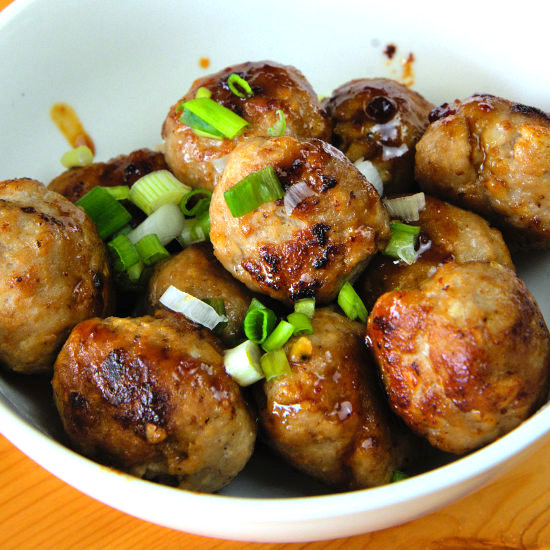 Easy Asian pork meatballs with Chinese BBQ sauce. Pan-fry and coat with sauce. Make a large batch to freeze for up to a month.