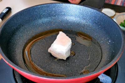 - Pan-fry the pork for two minutes until all the sides are sear and colored.