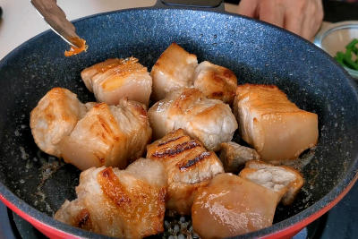 Now you can proceed to caramelize the pork in the pan in the following step.