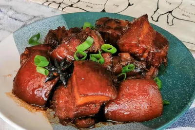 The pork is cooked until the fat is gelatinized, and the meat attains the melt in the mouth texture. The braising liquid is cooked down to a sticky sauce, glazing the meat to add a glossy sheen. It is best to serve with leafy vegetables, steamed rice, or noodles, and the taste is heavenly.