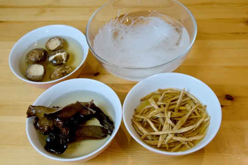 - Soak the dried shiitake mushrooms, wood ear fungus, dried lily buds, and mung bean vermicelli until fully hydrated. Lily buds and wood ear fungus take about 10 minutes; vermicelli takes 10–20 minutes; shiitake mushrooms may require several hours or overnight.