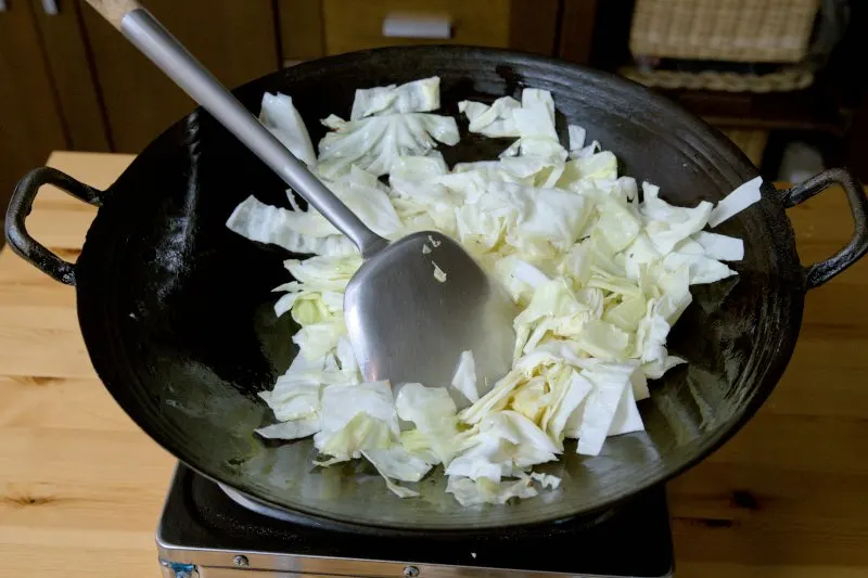 - Heat oil in a wok over medium heat. Stir-fry the cabbage for about 5 minutes, until softened.
