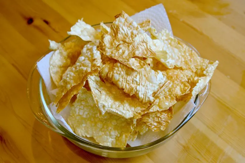 - Heat oil with a high smoking point to 180°C and deep-fry the bean curd sheet for 10–15 seconds, until blistered and puffed. Drain on paper towels.