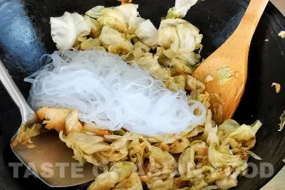 You need to add the glass noodles to the stir-fried cabbage in the final steps. The noodles will become soggy if you add at the early stage after cooking for too long.