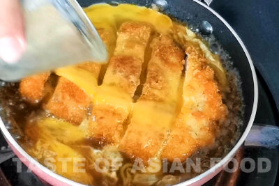 The temperature of the oil should be just right. If it is too cold, the breadcrumbs tend to drop off the chicken. If it is not hot enough, the surface will turn brown too quickly before the interior is cooked.