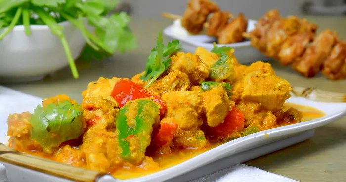Chicken tikka tastes fabulously by itself, even without the gravy. The similar set of spices is also used to marinate the larger pieces of chicken, and thread onto a long metal skewer. This chicken is baked in a large vessel call tandoor, which is the famous tandoori chicken.