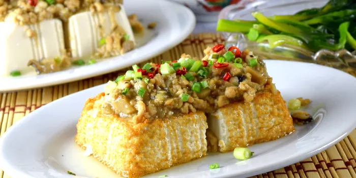Cantonese-style cold tofu is made with silken tofu chilled in the refrigerator. It is then drizzled with shallot oil and topped with crispy fried shallots. A mixture of oyster and light soy sauce is added to season the tofu and garnish it with chopped green onions and red chilies. This dish offers a unique combination of textures and flavors that make it a refreshing and delicious option for any meal.