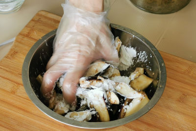 - Crack an egg. Separate the egg white from the yolk and mix with the eggplants. The egg white forms a protective layer on the surface and reduces the oil from entering into the eggplants’ structure. This step is a vital step to ensure the eggplant will not become oily after deep-frying.