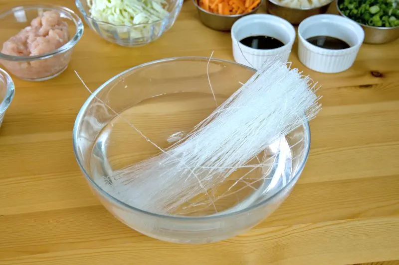 - Soak the glass noodles in warm water until soft. Drain and cut them into two-inch lengths with scissors.