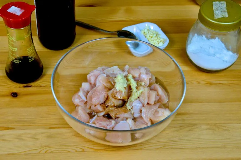 - Next, combine the chicken in light soy sauce, Shaoxing wine, minced ginger, egg whites, and cornstarch. Mix and rub these ingredients thoroughly into the meat, then let it marinate for at least half an hour.