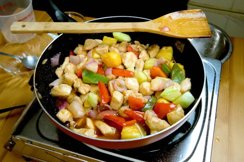 8. The final step is to return the chicken to the pan and mix it thoroughly with the vegetables and the sauce. Adjust the saltiness by performing a taste test. The sweet and sour chicken is now ready. It is usually served with white rice.