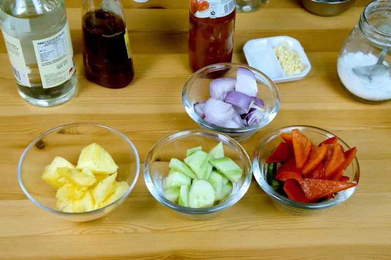 - Vegetables. The required vegetables are capsicum, cucumber, onion, and pineapple. For an additional source of sweetness, you can use canned pineapple instead of fresh pineapple and its juice.