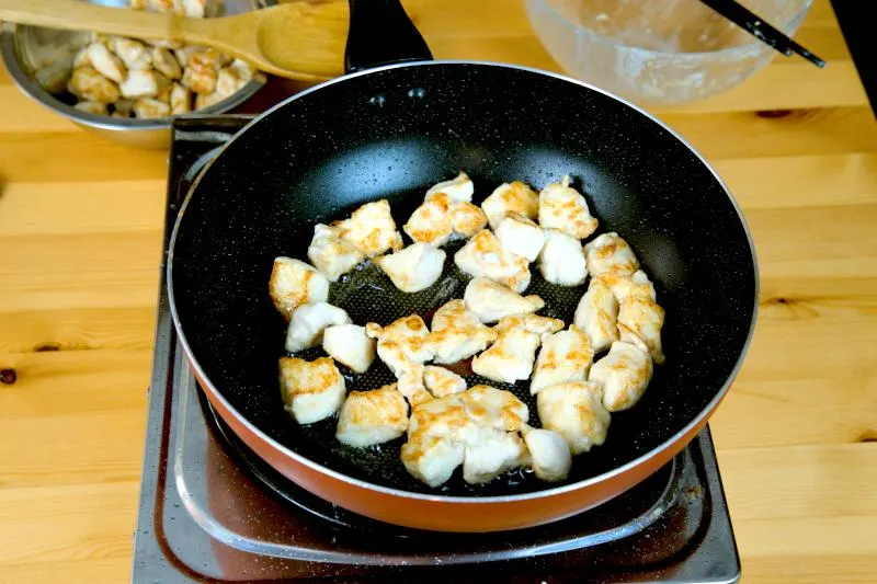 - Heat 2 tablespoons of vegetable oil in a nonstick pan. While heating to medium, add the chicken pieces and stir fry until the surface turns light brown.