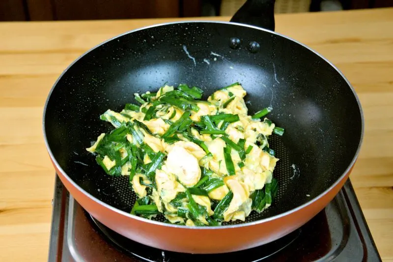 - Wash and cut the chives into 3/4-inch sections. Stir-fry for about 1 minute until they soften slightly and release their aroma. Once cooled, mix them into the egg mixture. Stir gently to combine.