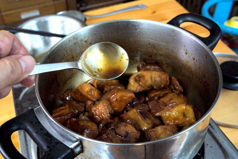 - Keep an eye on the water level during braising. Add hot water if needed to keep the pork mostly submerged. Stir and turn the pork pieces occasionally to ensure even cooking. Once the meat is tender, taste the sauce and adjust the seasoning if needed. Pay attention to the saltiness as the liquid has reduced.