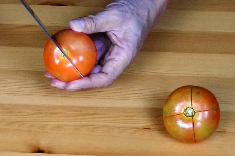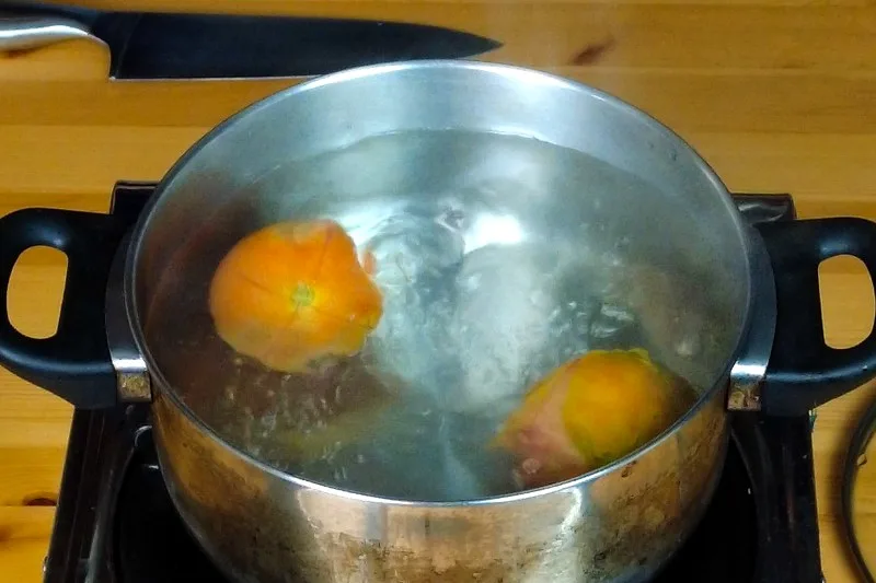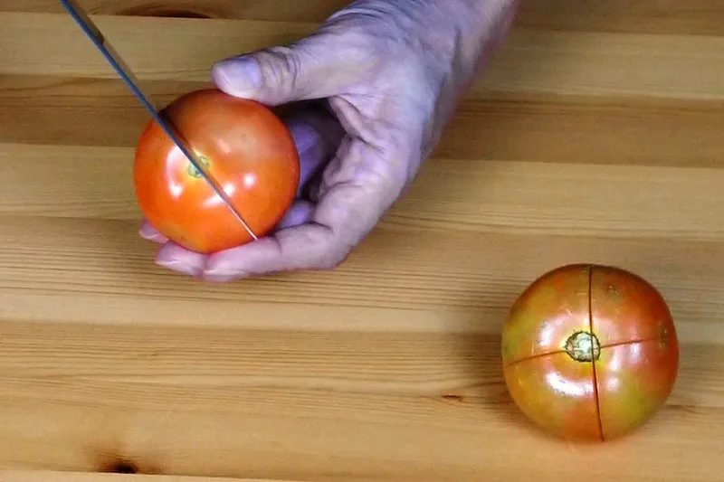 - First, score a shallow “X” on the top of each tomato using a sharp paring knife. Next, bring a pot of water to a rolling boil, ensuring enough to submerge all the tomatoes.