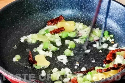 - Saute the ginger, garlic, scallion, and the dry chili until aromatic.