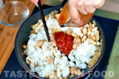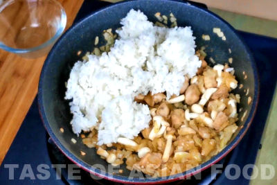 - Add the cooked rice. If you cook the rice specially for this purpose, cook it with slightly less water because we will add ketchup and soy sauce to the rice. Break up the rice and combine well with the chicken and onions.