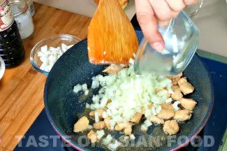 - Heat oil in the saucepan. Stir-fried the chicken is about 50 percent cooked, add the diced onions.