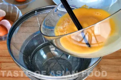 - Beat the eggs then pass through a wire mesh strainer to get a smooth texture.