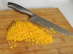 - The orange zest should be finely minced. Run the chef knife over the zest to mince it to ensure no large pieces are present. This process takes some extra time, but I think it is worth it. I believe that none of my customers like to chew on large pieces of orange peel. So far, I have not encountered any negative feedback regarding this after so many years.