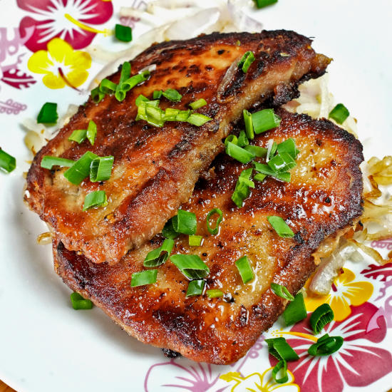 - Transfer the pork chops and onions to plates. Sprinkle the thinly sliced spring onions on top to serve.