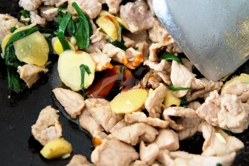 - Continue stirring-frying the pork until it is cooked and both sides turn light brown.