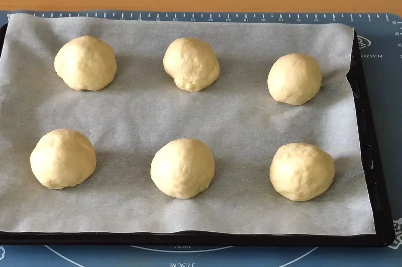 Place the buns on a baking tray lined with baking shee tand spacing them apart as they will expand in the oven. Set them aside to rise until they double in size again.