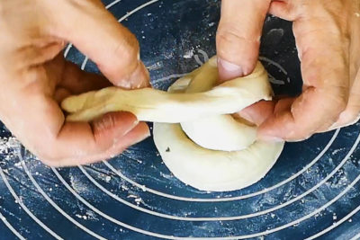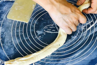 - Roll up the dough like making a Swiss roll. Roll and stretch the dough to form a long rope.