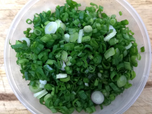 We often underestimate the amount of scallion required, as the abundance of chopped scallion will quickly wither and vanish in the rice. There is not too much scallion; by all means, use the green and white sections.