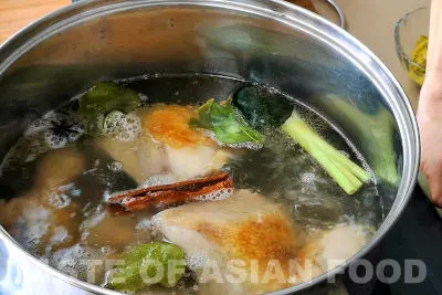 - Deep-fry the marinated chicken until the surface turns golden brown. Transfer the chicken into a stockpot filled with water, then add cinnamon bark, star anise, bashed lemongrass, and kaffir lime leaves (makrut lime leaves). Season with salt and pepper.