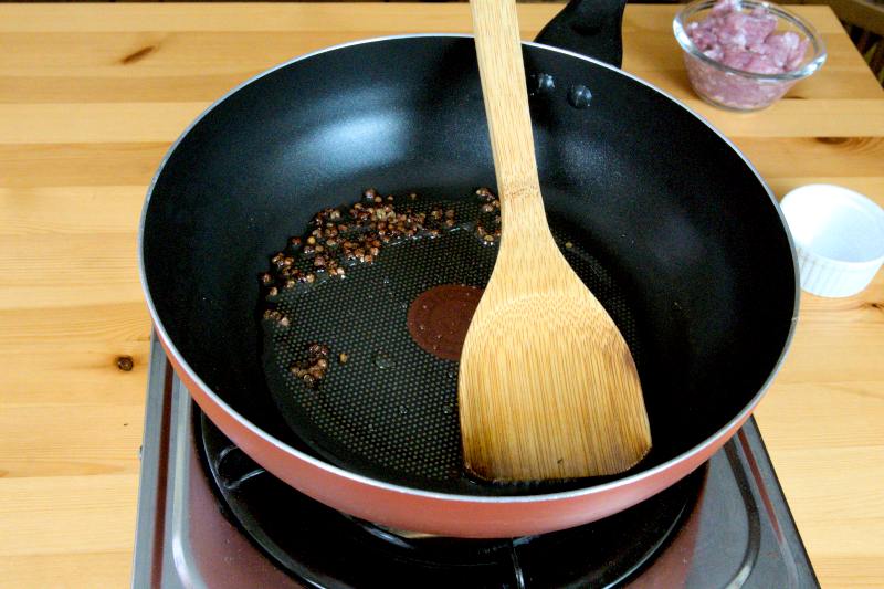 - Heat the vegetable oil in a pan and add one teaspoon of Sichuan peppercorns. Temper the Sichuan peppercorn over low heat for about one minute until the flavors develop. Then, let the oil pass through a fine-mesh strainer to remove the peppercorns.