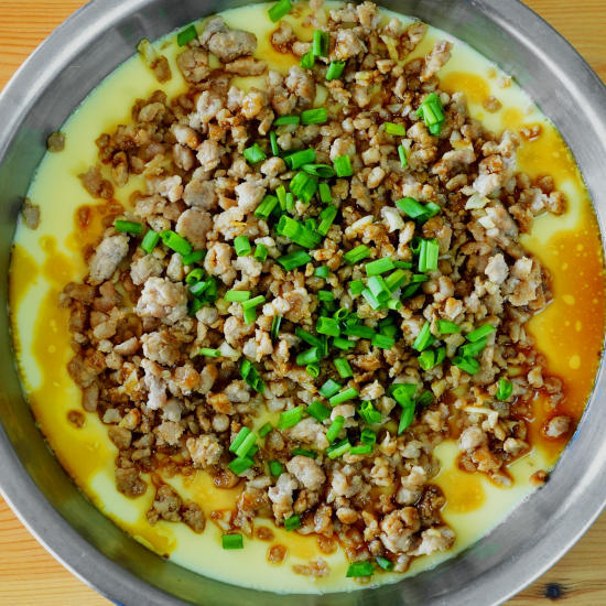 Today’s recipe is a delightful twist on the original recipe with minced pork as a topping. The minced pork is first fried to golden and slightly crispy, offering a contrasting texture to the more subtle egg flavor.