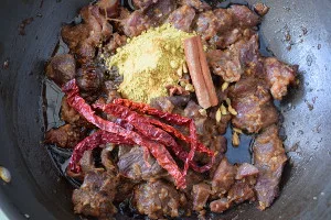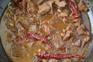 Well, it is certainly hard to imagine what it tastes like by just knowing the name. So, now I’ll paint a picture in your mind- succulent beef stewed for hours with a symphony of flavor with cinnamon sticks, fennel seeds, cumin seeds, cardamom, star anise, tamarind juice and the fiery spicy flavor of dry chilli.