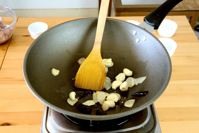 1. Cut the chicken into large pieces, bone-in, skin-on. Heat 1/3 of the sesame oil to saute ginger, garlic, and dried chili peppers in a wok. Since the smoking point of sesame oil is relatively low (about 160°C/320°F), saute over low to medium heat to prevent the sesame oil from turning into smoke.
