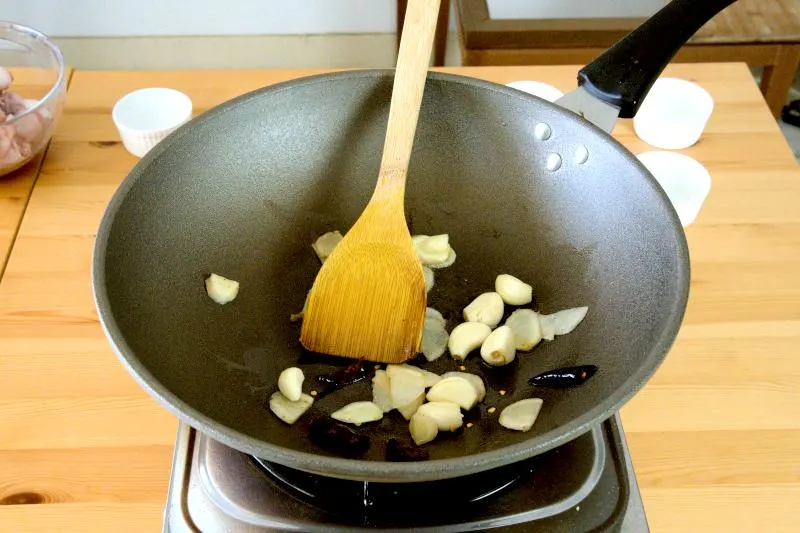 - Heat up 1 tablespoon of vegetable oil in a wok to saute ginger, garlic and dried chili..