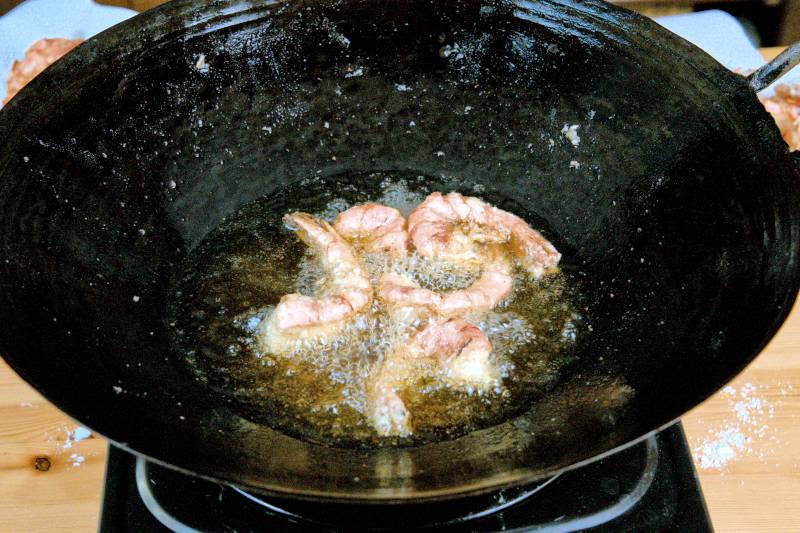 5. Heat enough oil in a deep skillet to around 150°C (300°F), and fry the shrimp in small batches. Each batch should fry for about one minute or until the shells turn pink. Set the shrimp aside to cool for a few minutes. Then deep-fry them over high heat again at around 190°C (375°F) for 30 seconds until crispy. (Frying the shrimp twice will make it extremely crispy).