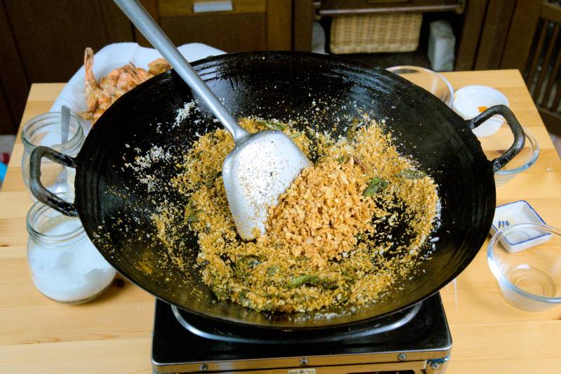 7. Season with curry powder (if using) and a small pinch of salt and sugar. Add the fried shrimp back into the wok, turn up the heat, and toss everything together to let the garlic and bread crumbs coat the shrimp thoroughly.