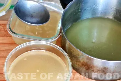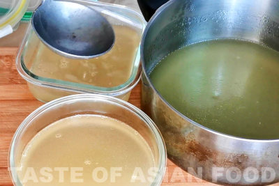 Add the pork skin to the bones and simmer for about 3 hours. Remove the bones and skin, and filter the broth to get a clear liquid. Transfer to a container and keep it refrigerated until it turns into jelly. It is now ready to mix with the filling.