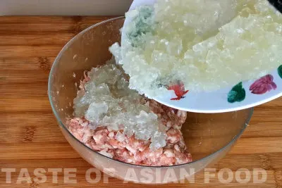 - Add the aspic to the minced meat. The amount of aspic should be the same as the filling. Mix well.